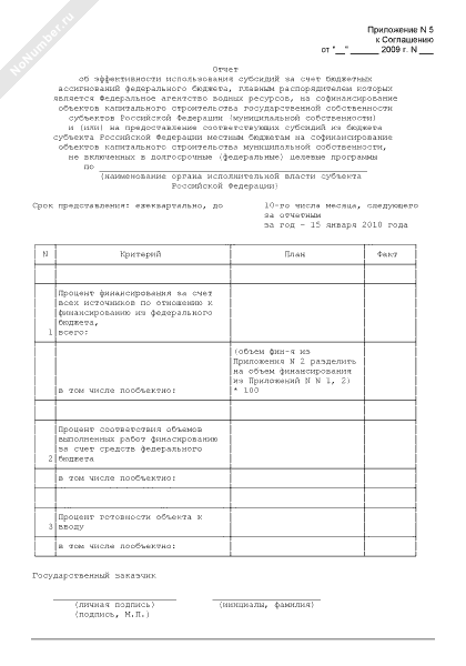 - 1539Отчет об эффективности использования субсидий за счет бюджетных ассигнований федерального бюджета, главным распорядителем которых является Федеральное агентство водных ресурсов, на софинансирование объектов капитального строительства государственной собственности субъектов РФ (муниципальной собственности) и (или) на предоставление соответствующих субсидий на софинансирование объектов капитального строительства муниципальной собственности, не включенных в долгосрочные (федеральные) целевые программы (приложение к соглашению)