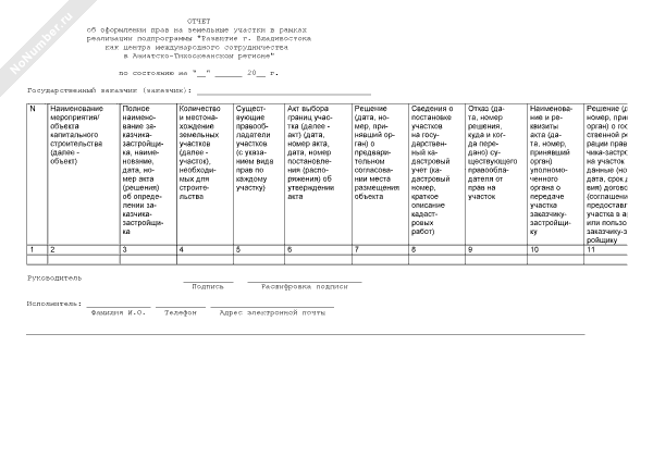 - 1523Отчет об оформлении прав на земельные участки в рамках реализации подпрограммы «Развитие г. Владивостока как центра международного сотрудничества в Азиатско-Тихоокеанском регионе». Форма предоставления отчетности № 3