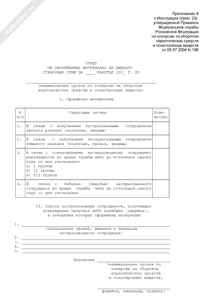 - 1522Отчет об оформленных материалах на выплату страховых сумм сотрудникам органов по контролю за оборотом наркотических средств и психотропных веществ