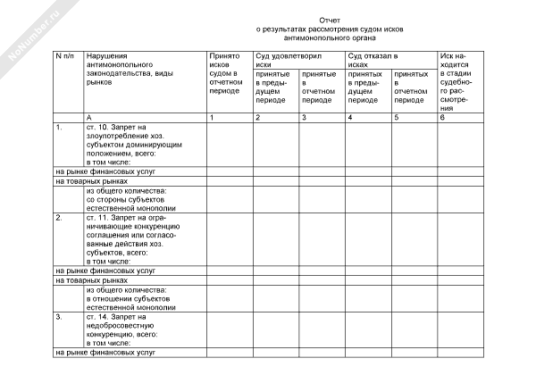 - 1525Отчет об удовлетворении исков антимонопольного органа, поданных в суд в соответствии с требованиями Федерального закона «О защите конкуренции». Форма № 3 (полугодовая, годовая)