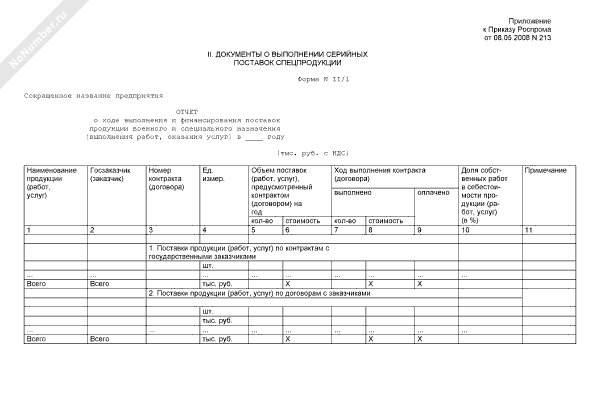 - 1623Отчет предприятия, находящегося в сфере ведения и координации Роспрома, о ходе выполнения и финансирования поставок продукции военного и специального назначения (выполнения работ, оказания услуг). Форма № II/1
