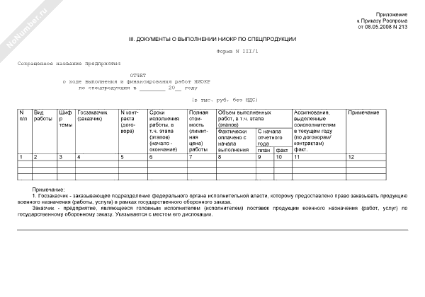 - 1624Отчет предприятия, находящегося в сфере ведения и координации Роспрома, о ходе выполнения и финансирования работ НИОКР по спецпродукции. Форма № III/1
