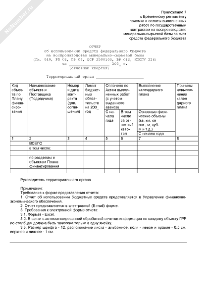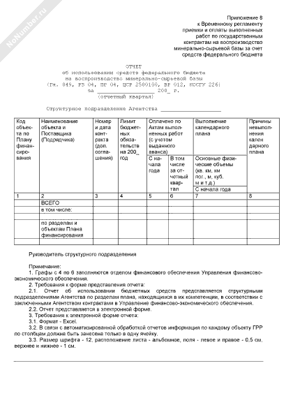- 1656Отчет территориального органа Федерального агентства по недропользованию об использовании средств федерального бюджета на воспроизводство минерально-сырьевой базы (Гл. 049, РЗ 04, ПР 04, ЦСР 2500100, ВР 012, КОСГУ 226) за отчетный квартал