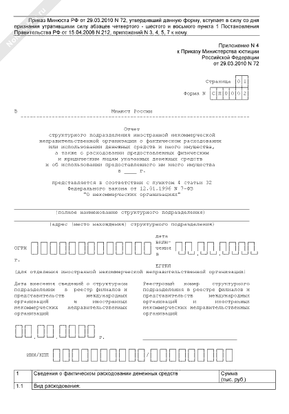 - 1646Отчет структурного подразделения иностранной некоммерческой неправительственной организации о фактическом расходовании или использовании денежных средств и иного имущества, а также о расходовании предоставленных физическим и юридическим лицам указанных денежных средств и об использовании (предоставленного им иного имущества представляется в соответствии с пунктом 4 статьи 32 Федерального закона от 12.01.1996 № 7-ФЗ «О некоммерческих организациях»). Форма № СП0002