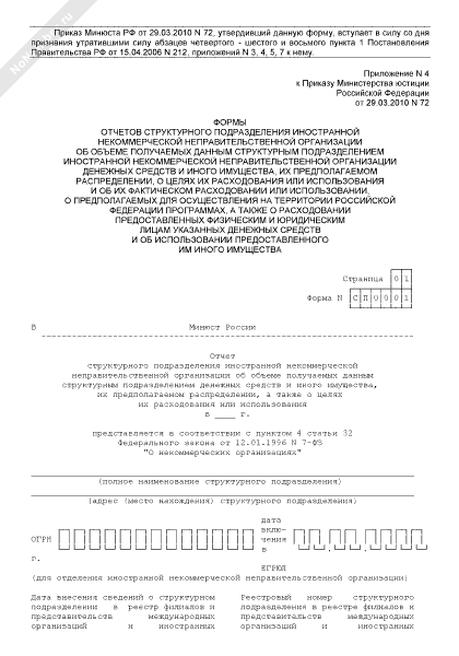 - 1645Отчет структурного подразделения иностранной некоммерческой неправительственной организации об объеме получаемых данным структурным подразделением денежных средств и иного имущества, их предполагаемом распределении, а также о целях их расходования или использования (представляется в соответствии с пунктом 4 статьи 32 Федерального закона от 12.01.1996 № 7-ФЗ «О некоммерческих организациях»). Форма № СП0001