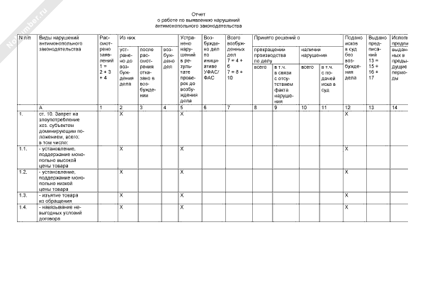 - 1654Отчет территориальных органов и центрального аппарата Федеральной антимонопольной службы о работе по выявлению нарушений антимонопольного законодательства. Форма № 1 (полугодовая, годовая)