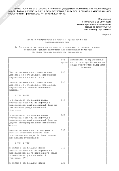 - 1867Формы отчетности негосударственного пенсионного фонда по обязательному пенсионному страхованию. Отчет о застрахованных лицах и правопреемниках застрахованных лиц (форма № 5)