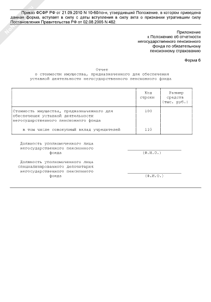 - 1868Формы отчетности негосударственного пенсионного фонда по обязательному пенсионному страхованию. Отчет о стоимости имущества, предназначенного для обеспечения уставной деятельности негосударственного пенсионного фонда (форма № 6)
