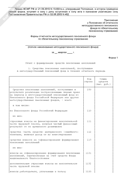 - 1863Формы отчетности негосударственного пенсионного фонда по обязательному пенсионному страхованию. Отчет о формировании средств пенсионных накоплений (форма № 1)