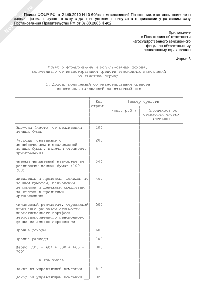 - 1865Формы отчетности негосударственного пенсионного фонда по обязательному пенсионному страхованию. Отчет о формировании и использовании дохода, полученного от инвестирования средств пенсионных накоплений за отчетный период (форма № 3)