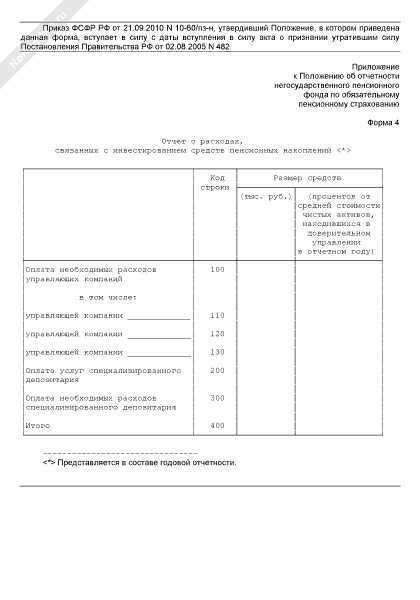 - 1866Формы отчетности негосударственного пенсионного фонда по обязательному пенсионному страхованию. Отчет о расходах, связанных с инвестированием средств пенсионных накоплений (форма № 4)
