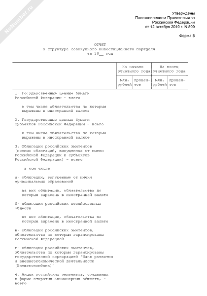- 1876Формы публикуемой Федеральной службой по финансовым рынкам отчетности о средствах пенсионных накоплений и финансовых результатах их инвестирования. Отчет о структуре совокупного инвестиционного портфеля (форма № 8)