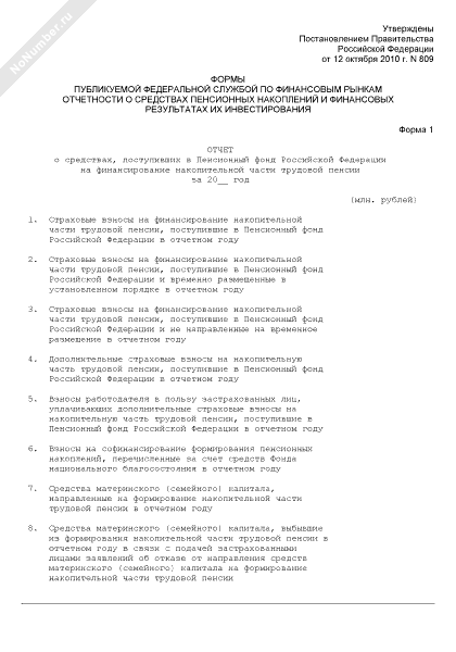 - 1869Формы публикуемой Федеральной службой по финансовым рынкам отчетности о средствах пенсионных накоплений и финансовых результатах их инвестирования. Отчет о средствах, поступивших в Пенсионный фонд Российской Федерации на финансирование накопительной части трудовой пенсии (форма № 1)