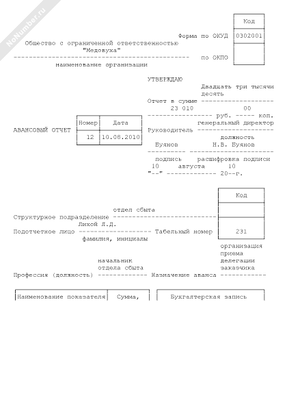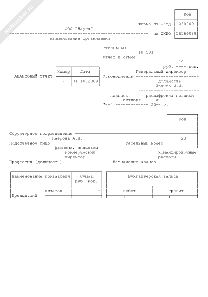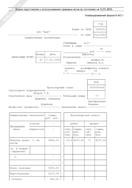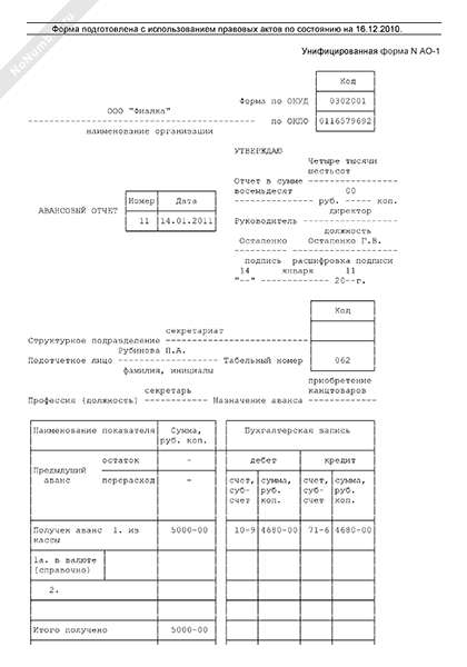 Авансовый отчет (образец заполнения унифицированной формы № АО-1)