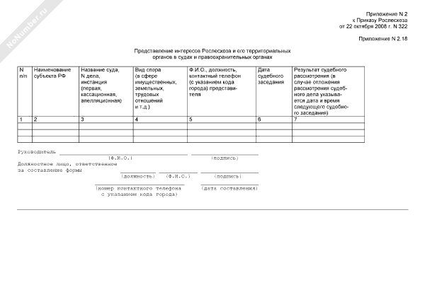 Отчет Департамента лесного хозяйства. Представление интересов Рослесхоза и его территориальных органов в судах и правоохранительных органах. Форма № 2.18 (рекомендуемый образец заполнения)