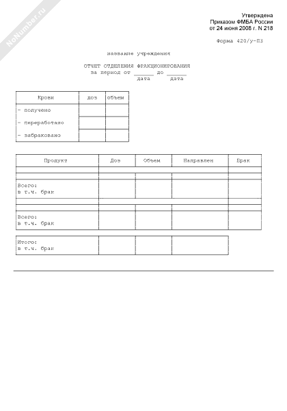 Отчет отделения фракционирования. Форма № 420/у-П3