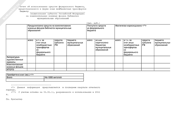 Отчет об использовании средств федерального бюджета, предоставленного в форме иных межбюджетных трансфертов на комплектование книжных фондов библиотек муниципальных образований (приложение к соглашению между уполномоченным органом исполнительной власти субъекта Российской Федерации и Министерством культуры Российской Федерации о предоставлении в 2011 году из федерального бюджета бюджету субъекта Российской Федерации иных межбюджетных трансфертов на комплектование книжных фондов библиотек муниципальных образований (государственных библиотек города Москвы или города Санкт-Петербурга)