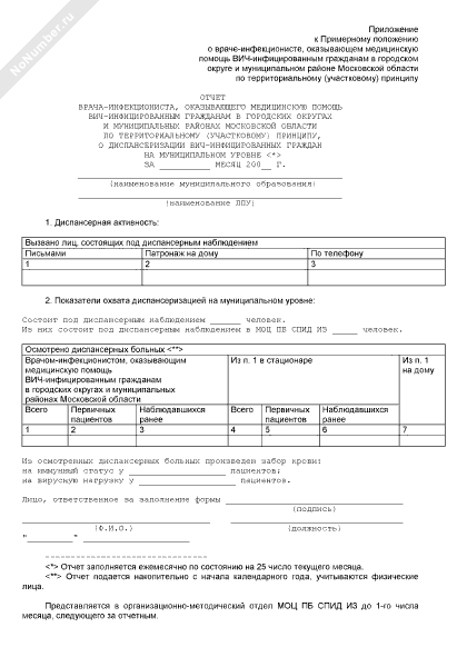 Отчет врача-инфекциониста, оказывающего медицинскую помощь ВИЧ-инфицированным гражданам в городских округах и муниципальных районах Московской области по территориальному (участковому) принципу, о диспансеризации ВИЧ-инфицированных граждан на муниципальном уровне