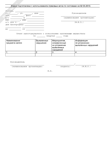 Отчет залогодержателя о пользовании заложенным имуществом (рекомендуемый образец заполнения)