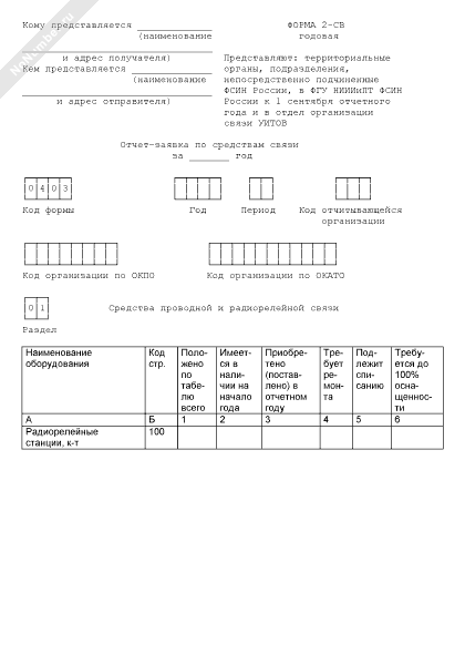 Отчет-заявка по средствам связи. Форма № 2-СВ (рекомендуемый образец заполнения)