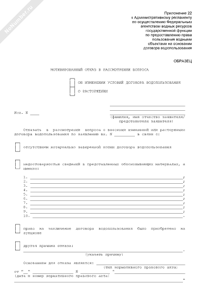 - 3Мотивированный отказ в рассмотрении вопроса об изменении (о расторжении) условий договора водопользования