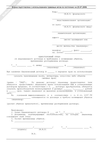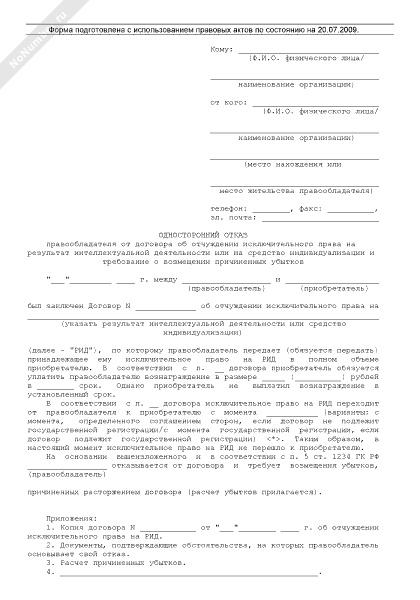 - 7Односторонний отказ от лицензионного договора и требование о возмещении убытков, причиненных расторжением договора
