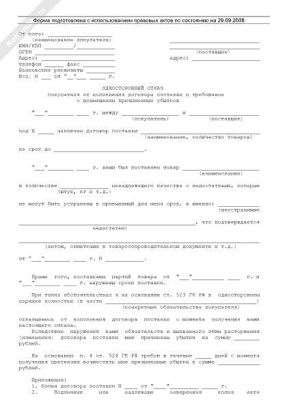 - 4Односторонний отказ покупателя от исполнения договора поставки и требование о возмещении причиненных убытков