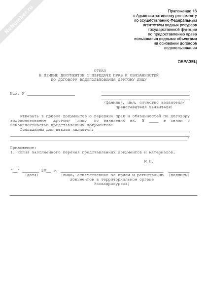 - 15Отказ в приеме документов о передаче прав и обязанностей по договору водопользования другому лицу