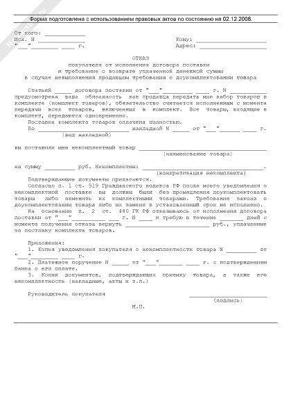 Отказ покупателя от исполнения договора поставки и требование о возврате уплаченной денежной суммы в случае невыполнения продавцом требования о доукомплектовании товара (рекомендуемый образец заполнения)