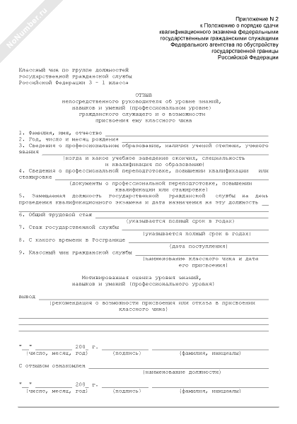 - 25Отзыв непосредственного руководителя об уровне знаний, навыков и умений (профессиональном уровне) гражданского служащего Федерального агентства по обустройству государственной границы Российской Федерации и о возможности присвоения ему классного чина