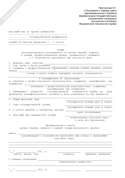 - 24Отзыв непосредственного руководителя об уровне знаний, навыков и умений (профессиональном уровне) гражданского служащего и о возможности присвоения ему классного чина в центральном аппарате Федеральной таможенной службы