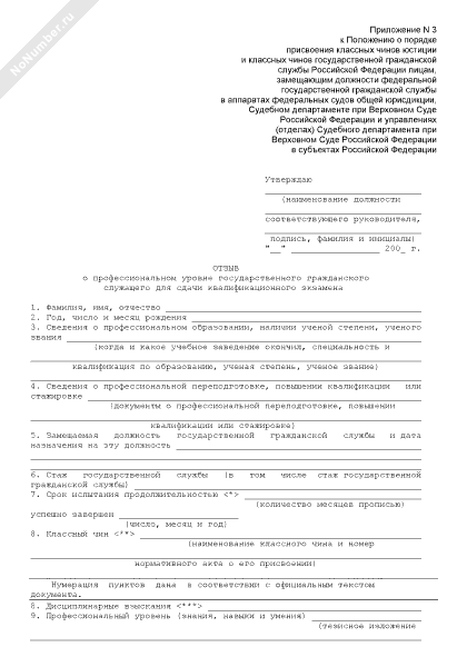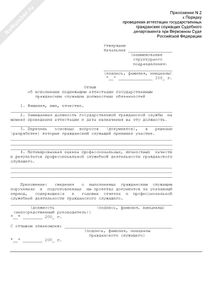 - 30Отзыв о профессиональном уровне для сдачи квалификационного экзамена государственного гражданского служащего государственной гражданской службы Российской Федерации, замещающего должность федеральной государственной гражданской службы в аппаратах федеральных судов общей юрисдикции, Судебном департаменте при Верховном Суде Российской Федерации