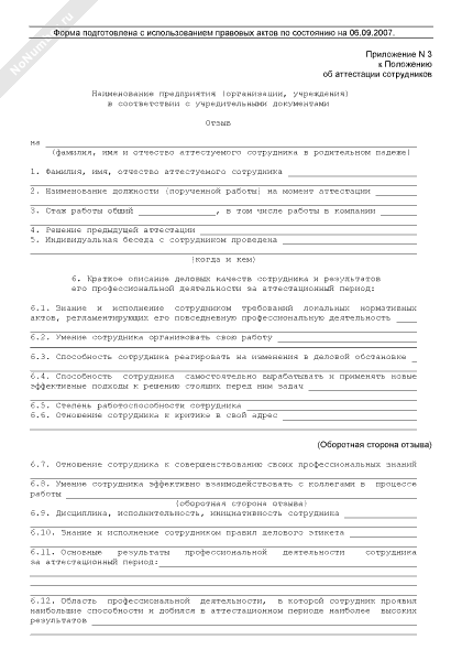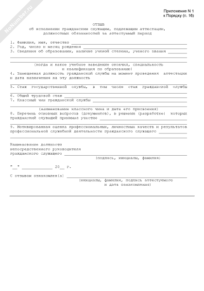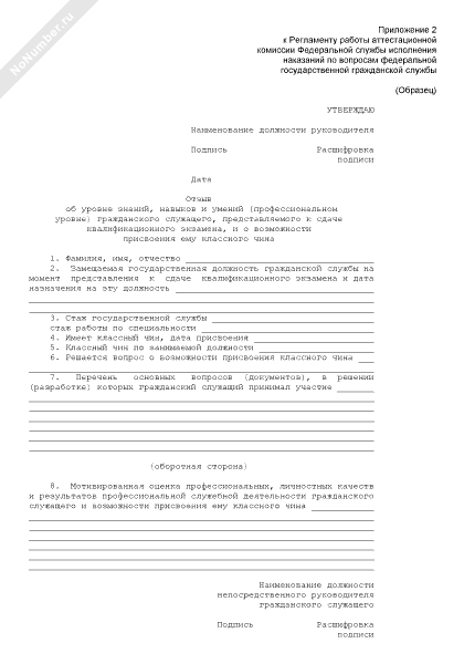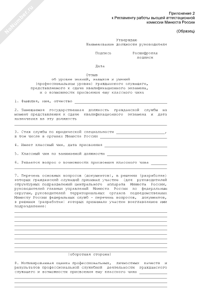 - 73Отзыв об уровне знаний, навыков и умений (профессиональном уровне) гражданского служащего, представляемого к сдаче квалификационного экзамена, и о возможности присвоения ему классного чина
