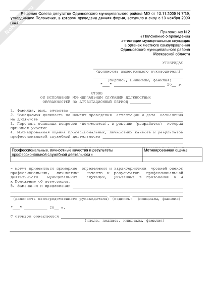 - 64Отзыв об исполнении муниципальным служащим Одинцовского муниципального района Московской области должностных обязанностей за аттестационный период