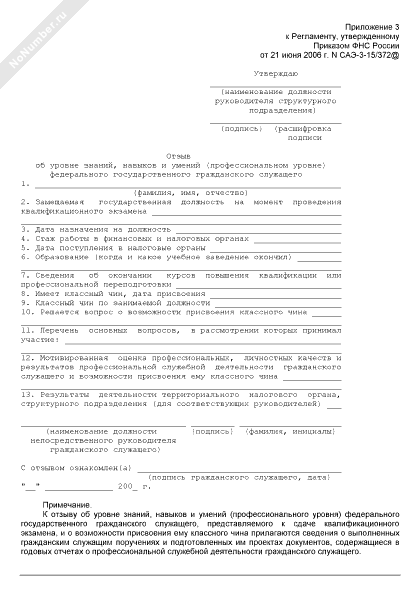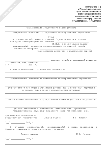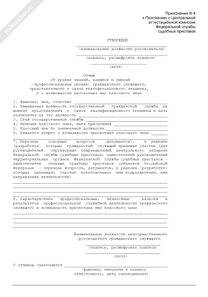 - 74Отзыв об уровне знаний, навыков и умений (профессиональном уровне) гражданского служащего Федеральной службы судебных приставов, представляемого к сдаче квалификационного экзамена, и о возможности присвоения ему классного чина
