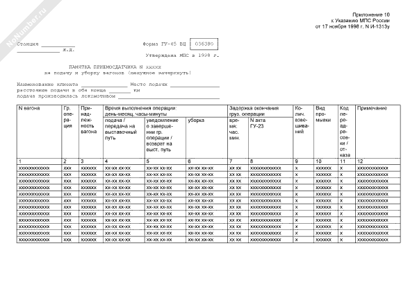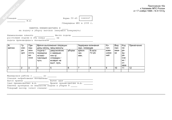 Памятка приемосдатчика на подачу и уборку вагонов. Форма № ГУ-45 ВЦ