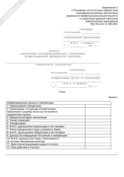 Паспорт лаборатории психофизиологического обеспечения профессиональной деятельности персонала энергетических предприятий. Информационные данные о лаборатории (форма № 1)
