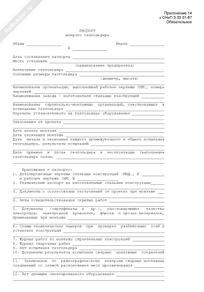 Паспорт мокрого газгольдера (рекомендуемый образец заполнения)