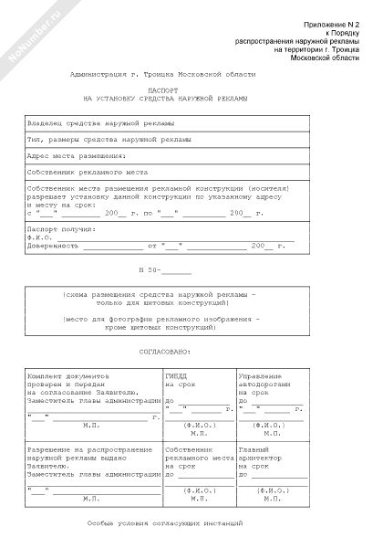 Паспорт на установку средства наружной рекламы на территории г. Троицка Московской области (рекомендуемый образец заполнения)