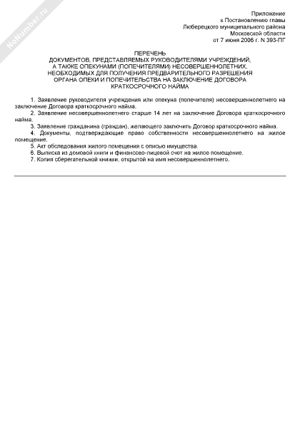 - 185Перечень документов, представляемых руководителями учреждений, а также опекунами (попечителями) несовершеннолетних, необходимых для получения предварительного разрешения органа опеки и попечительства на заключение договора краткосрочного найма на территории Люберецкого района Московской области