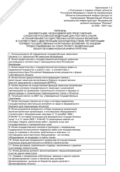 - 248Перечень документации, необходимой для представления субъектом Российской Федерации для участия в отборе и планирования государственных капитальных вложений в соответствии с действующим законодательством, регулирующим порядок государственных капитальных вложений, по каждому предоставляемому на отбор проекту модернизации объектов коммунальной инфраструктуры