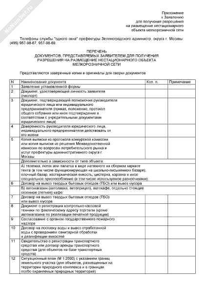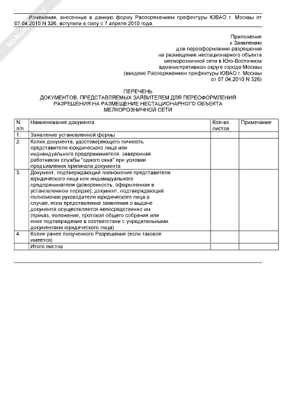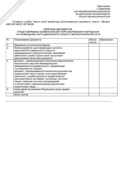 - 245Перечень документов, представляемых заявителем для переоформления разрешения на размещение нестационарного объекта мелкорозничной сети (приложение к заявлению для переоформления разрешения на размещение нестационарного объекта мелкорозничной сети в Юго-Восточном административном округе города Москвы)