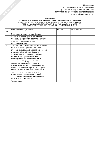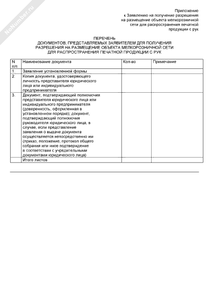 - 256Перечень документов, представляемых заявителем для получения разрешения на размещение объекта мелкорозничной сети для распространения печатной продукции с рук (приложение к заявлению для получения разрешения на размещение объекта мелкорозничной сети для распространения печатной продукции с рук)