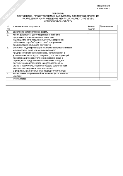 - 287Перечень документов, представляемых заявителем для переоформления разрешения на размещение нестационарного объекта мелкорозничной сети (приложение к заявлению для переоформления разрешения на размещение нестационарного объекта мелкорозничной сети в городе Москве)