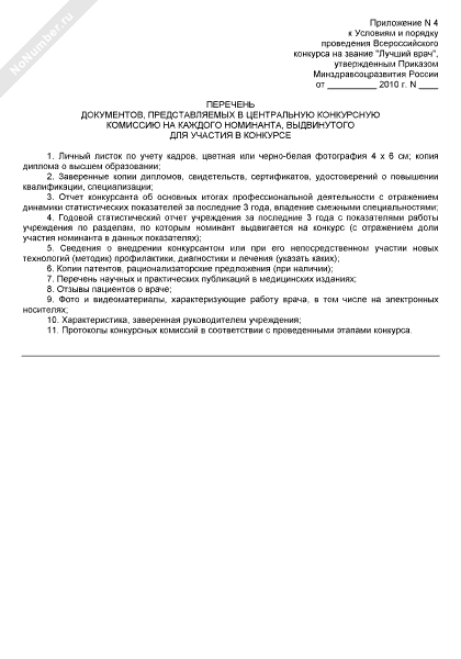 - 336Перечень документов, представляемых в центральную конкурсную комиссию на каждого номинанта, выдвинутого для участия в конкурсе на звание «Лучший врач»