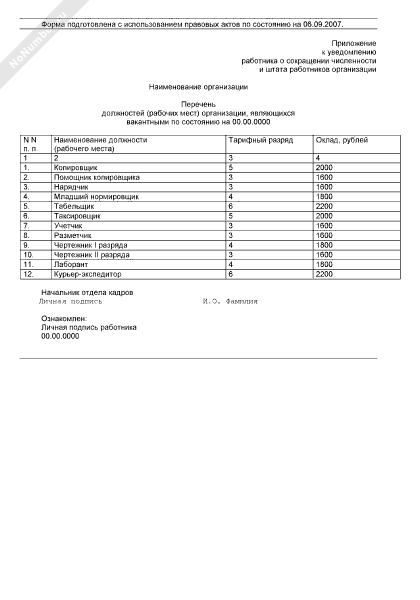 - 348Перечень должностей (рабочих мест) организации, являющихся вакантными (приложение к уведомлению работника о сокращении численности и штата работников организации)