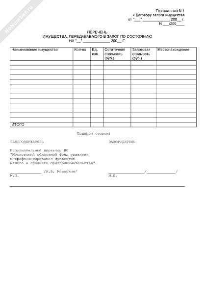 - 429Перечень имущества, передаваемого в залог (приложение к договору залога имущества (залогодержатель — НО «Московский областной фонд развития микрофинансирования субъектов малого и среднего предпринимательства») при обеспечении обязательств по договору займа)