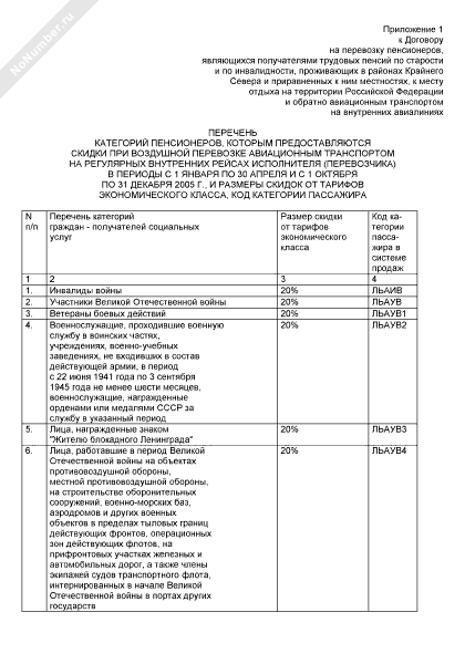 - 440Перечень категорий пенсионеров, которым предоставляются скидки при воздушной перевозке авиационным транспортом на регулярных внутренних рейсах исполнителя (перевозчика) в периоды с 1 января по 30 апреля и с 1 октября по 31 декабря 2005 г., и размеры скидок от тарифов экономического класса (приложение к договору на перевозку пенсионеров, являющихся получателями трудовых пенсий по старости и по инвалидности, проживающих в районах Крайнего Севера и приравненных к ним местностях)
