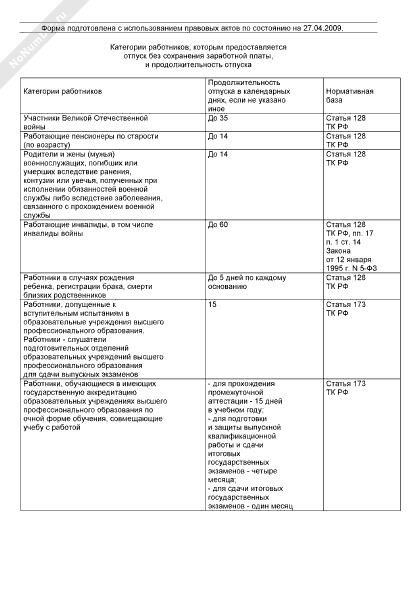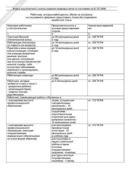 - 442Перечень категорий работников, которым работодатель обязан на основании их письменного заявления предоставить отпуск без сохранения заработной платы
