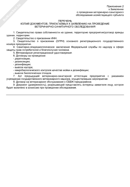 - 447Перечень копий документов, прилагаемых к заявлению на проведение ветеринарно-санитарного обследования (приложение к заявлению о проведении ветеринарно-санитарного обследования хозяйствующего субъекта)